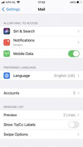 Ga allereerst naar instellingen via het tandwieltje op uw startscherm. Daarna zoekt u in het menu naar het item “Mail” (met een enveloppe er voor). Kies het item Mail: